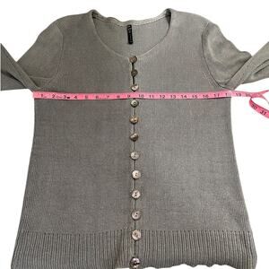 100% linen button front cardigan sweater. Long sleeves, ribbed cuff and hem. Round neckline. Gray. Tags says XL but measures like a medium. Please see photos for measurements.