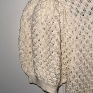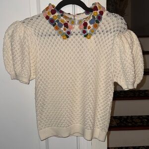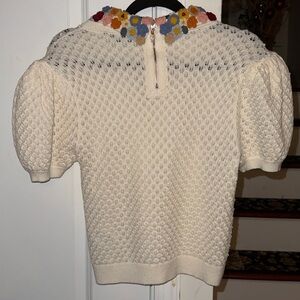 Elegant cream knit top with a multicolor floral accent. Adds a playful touch to any outfit.