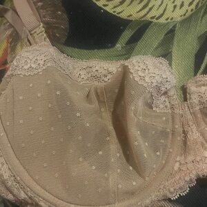 Adjustable shoulder straps with gold hardware, double back hook and eye closure, scallop lace trim around the band, sides and top of cups, inner cup partial lined attached Demi-pad for lift effect, mesh-lined dotted swiss lace cups. Size 34DD