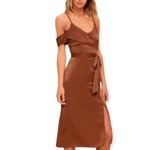 J.O.A. Anouk Satin Draped Shoulder Midi Dress S Side Slit Strappy Cocktail Brown