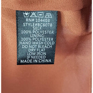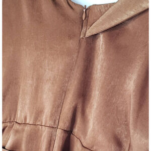 Key features: medium brown (rust orange) silky fabric, spaghetti straps with a draped shoulder, back zip, partially lined, fabric tie belt