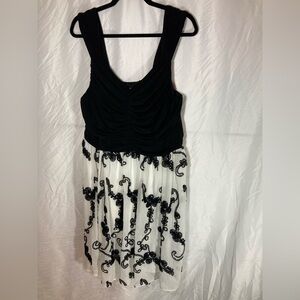 Black and white dress. I’d call it frilly but it isn’t really. Solid black top -two layers so it is heavy, and white sheath on bottom with sheer outer layer. Worn once. Size 16.