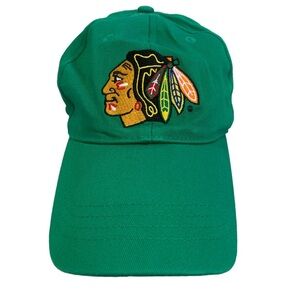 This hat is perfect for a collector of sports memorabilia, a fan of vintage streetwear, or a Chicago Blackhawks supporter. The color is a vibrant green, and the logos are well-preserved. It appears to be in good pre-owned condition with some signs of wear consistent with its age, but no major flaws.