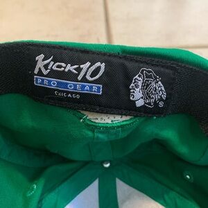 This is a unique and retro-style green baseball cap featuring the Chicago Blackhawks logo embroidered on the front. On the side, there's a stitched patch for Miller Lite, giving it a distinctive vintage look. The inside tag shows the brand as "Kick10 Pro Gear Chicago," which points to it being a unique crossover item.
