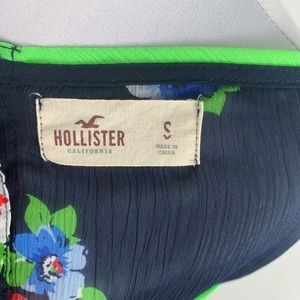 Hollister top. Scoop neck, short sleeves. Navy blue with floral pattern and neon green trim. Button back. Lightweight and semi sheer. Care tag removed, but otherwise in great condition!