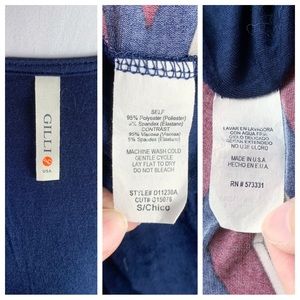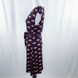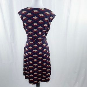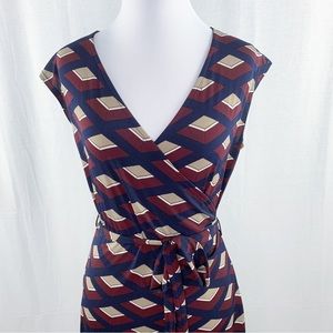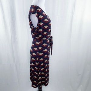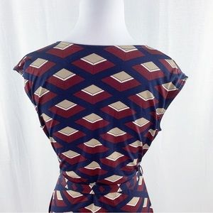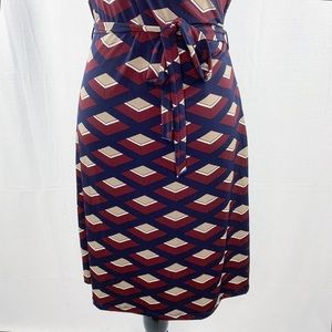 Gilli dress. Cap sleeves, v-neck. Faux wrap top with tie waist belt. Burgundy and navy blue abstract geometric pattern. Work appropriate. I can’t remember where I bought this, but this brand is sold at both ModCloth and through Stitch Fix. Only worn once or twice and in excellent condition!