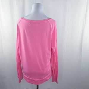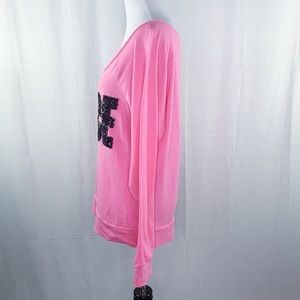 Heartless Romantics top. Long sleeves. Scoop neck. Solid pink top with DANCE spelled out in black sequins. No size tag, but photographed here on a standard size small mannequin (mannequin measures 33” bust, 24” waist, 34” hips). One small snag pictured and some pilling from normal wear. Otherwise in good condition!