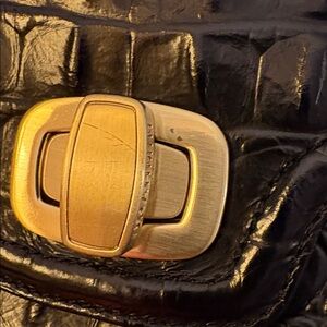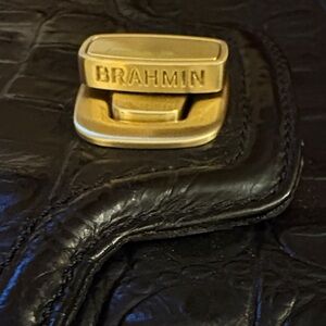 This chic black croc-embossed shoulder bag is perfect for any occasion. Its sleek design and gold-tone hardware add a touch of sophistication to your outfit. Genuine Brahmin bag with zip top and adjustable strap. Front pocket has kiss lock closure and multiple ID/card pockets under the flap. Main compartment has zip closure and small interior zip pocket. Brass hardware and interior brass tag stamped “Brahmin.” Exterior hang tag not included. Adjustable crossbody strap. Small imperfection/scratch on brass kiss lock closure (see last photo).