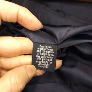 EUC Pretty transitional denim blazer with tiny white polka dots from J. Crew. Blazer is completely lined with two button closure, chest pocket, front flap pockets, and inside pockets on the left side. There's also a slash pocket above the flap pocket on the right side that's still sewn shut, and the larger of the two inside pockets is also still sewn shut. Cuffs have four button decoration, and jacket has back center slit at hem for ease of movement. No size tag, but I wear a large in coats and jackets and this fit me with a t-shirt, but with a sweater underneath it might be a little snug. So please check provided measurements. Bust 31, waist 19, hem 21, length 24 inches. Please see all photos.