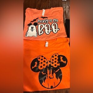 Set of two orange graphic tees with Halloween designs. Perfect for festive occasions. Casual/Disney/Halloween party/Festival/Not so Scary
