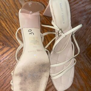 Marc Fisher Elegant cream strappy sandals with a block heel. Perfect for any occasion.