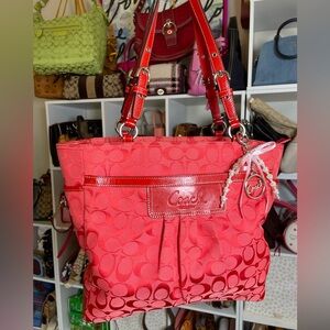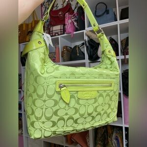 Chic Coach bag in lime green fabric. Cream leather tag with embossed details. Crafted for quality.