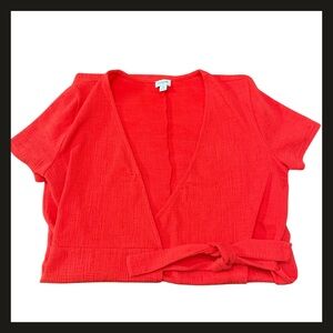Beautiful J.Crew women’s red faux wrap side-tie slip on dress, style # AK924 / SP20.