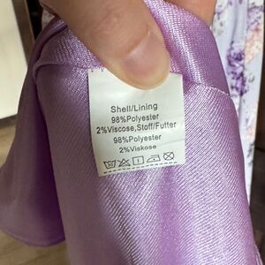 Lovely lavender dress with floral design. Comfortable and stylish. Sleeves can be worn up or off the shoulder. Worn once for Kentucky Derby party.
