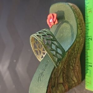 Stylish green wedges with intricate cut-out design. Features a pink floral accent on the strap.