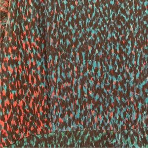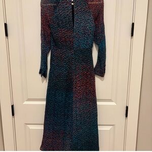 The dress is made from 100% silk and decorated with a beautiful blue flecked print. It features a fitted waist and full midi skirt that hits well below the knee and has elegant sheer selves and a keyhole opening at the back.