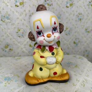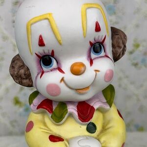 Adorable Vintage Lefton Clown Figurine. Ceramic china in a bisque like finish. Features hand-painted details and made in Taiwan. Such a cute face plus cheery colors!
