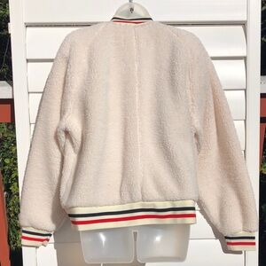 Cozy cream bomber jacket. Features striped cuffs and collar. Ideal for casual outings.