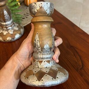 Cool antique-looking “steampunk” style candle holders with silver tone punched tin accents. Perfect for home decor. Bases are brown wood. No markings, brand unknown.