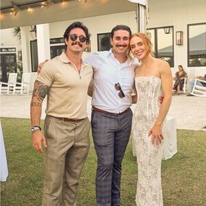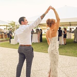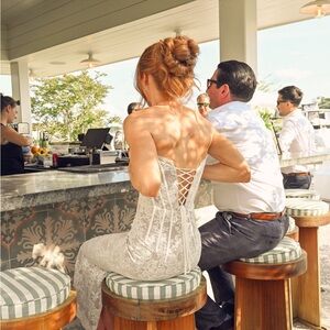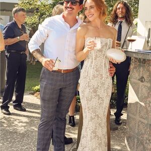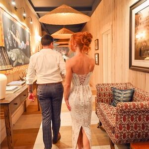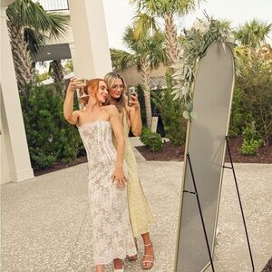 Elegant strapless midi dress. Features intricate lace design. Perfect for special occasions. Only worn once.