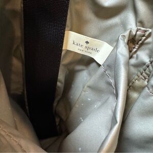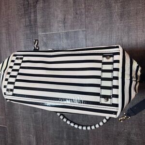 Elegant tote with black and cream stripes. Features sturdy handles and spacious interior. Ideal for daily use. Has some staining on the front of bag that can be cleaned. Interior is very clean. There is a strap where you can also use it as a crossbody diaper bag.