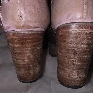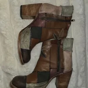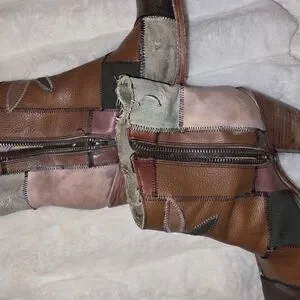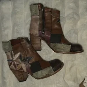 Freebird "Flowr" flower boots batchwork, intentional distressed details, raw, unfinished, frayed stitchwork, side zip, heels multicolored, rare, uniaue, boho, vintage, simulated wear/faux staining, canvas and leather handcrafted.