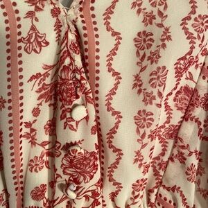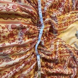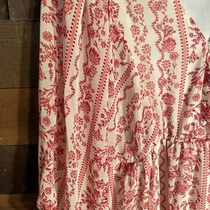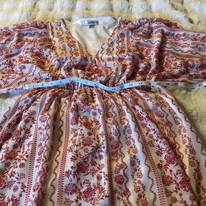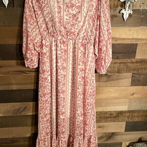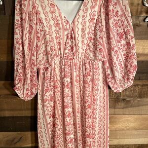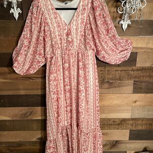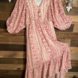 Elegant high low dress with intricate patterns. Features a button-up front and flowing sleeves. Ideal for versatile styling.Beautiful bohemian country dress shorter in the front , lined and will look beautiful with cowboy boots . Small alteration above the buttons can easily be taken out .