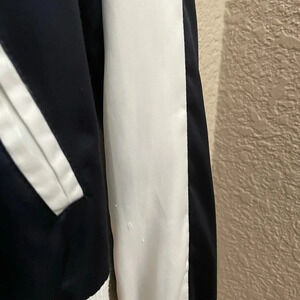 Features dark blue and white satin design with cactus embellishment on the front and welt pockets on both sides. Fully lined. Item is pre-owned and In overall great condition; normal wear and one very small snag on one sleeve (see photo). Pet and smoke free.