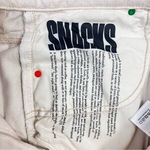 These MOTHER Snacks The Side Dish Cargo Skimp Jeans in Natural White are designed with a relaxed fit and a high-rise waist. Made of a comfortable cotton blend denim with stretch, these jeans feature a cargo pocket and a 5-pocket design for added convenience. The light wash and button accents give them a stylish look, perfect for winter, fall, or spring wear. The jeans are size 31 with a waist size of 32 inches, and they are brand new from the USA.