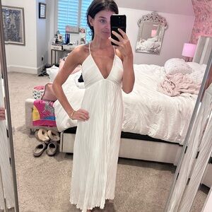 Chic mini dress with a striking pink base. Features a lively, intricate design. Flared hem and long sleeves enhance style.