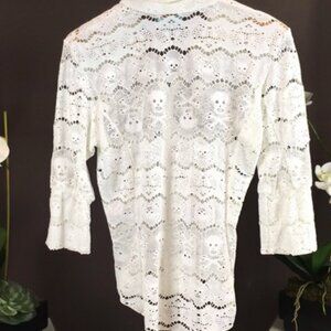 NWT - Le Tarte Chic beach pants and top, sold as a set! This skull lace print is taken to new lengths in a wide leg pant. This luxuriously soft peek-through fabric is detailed with a side hip drawstring, shell bit ends, and a pearl edge finish. Add your favorite swimwear underneath to take this look from the beach to the street! The Top is a 3/4 length sleeve that is perfect for the ensemble! All you need is a beach or pool to complete the look!