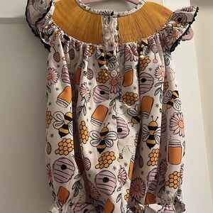Adorable 'Sweet as Honey' kids one piece featuring a playful bee and flower pattern. Perfect for adding a touch of fun to your child's wardrobe.