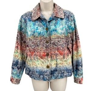 Gently worn, no visible flaws noted. Fabric and print look vibrant with no obvious defects. Buttons and cuffs appear intact. Please review photos for overall condition.