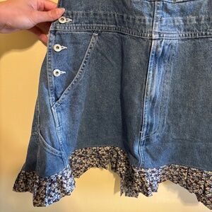 This apron is so adorable! It has ruffles around the hem, button detailing and a lot of storage in the pockets. This would be perfect for a full day of cooking on Thanksgiving of The 4th of July. It is in excellent condition with no fraying or ware. F