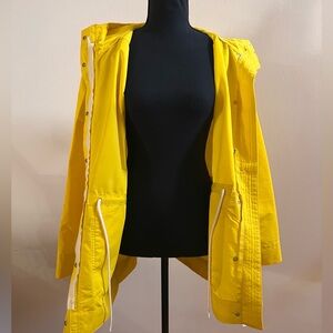 Brighten up your wardrobe with this stylish yellow hooded jacket. Perfect for any casual outing. Buttons and zipper.