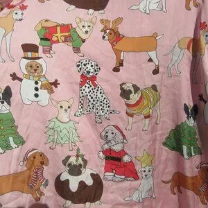 I am selling a Brand New Karen Mabon Pink Christmas Dog Pajama Top & Pants Set Size 3XL. They are brand new with tags (the top has the tag attached, the bottom doesn't have a tag). The set are a women's size 3XL. They are pink with dogs in Christmas outfits all over them. There are buttons down the front of the top. The top has long sleeves. The pants have a drawstring on the waist with elastic in the back. The pants have pockets. The set is 100% Polyester.