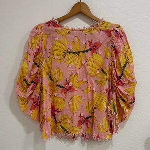 Chic floral sweater with vibrant red, green, and yellow tones. Features long sleeves and a playful pattern. Perfect for casual wear. Very stretchy. Some pilling from regular wear.