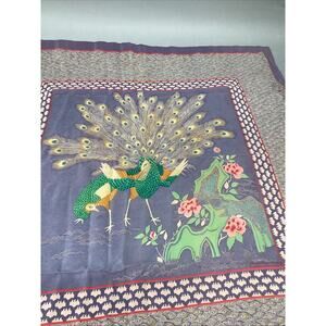 Vintage Peacocks 100% Silk Scarf - 34x30”. In very good condition. This features 2 peacocks and the peacock feathers around the entire border. It has a few stains on it from age and use.