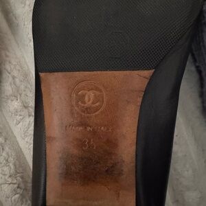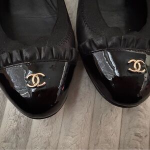Stylish black flats with patent leather toe. Features iconic CHANEL logo. Perfect for chic everyday wear.