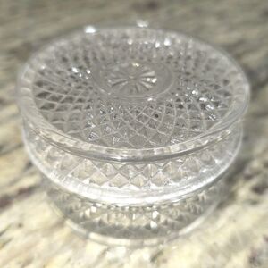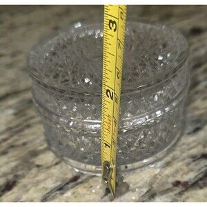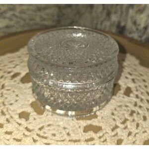 Vintage Diamond Cut Glass Dresser Vanity Trinket Jar w Ground Lid Clear 3" Diameter. Excellent Preowned Condition. Beautiful vintage collectible! Lovely gift. Ready to ship immediately.