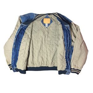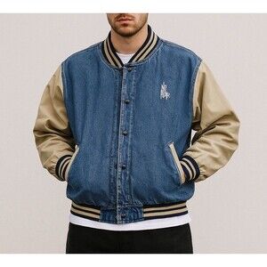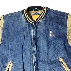 No Fear Varsity Jacket Mens L Denim Blue Beige Sleeve 90s Y2K Streetwear Retro