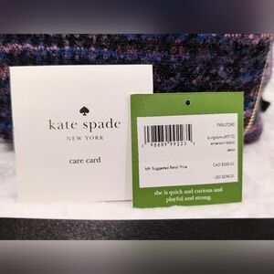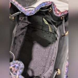 Constructed from colorful tweed, this 90s-inspired mini-backpack boasts a bunch of smart details, including adjustable straps, a snap closure and, our favorite, the zip-around front pocket. Tote it by the top handle, or toss it over a single shoulder to play up the old-school vibe. 8.6"h x 7.4"h x 4.1"d 30" adjustable shoulder straps tweed w/metallic details w/cow leather trim matte jacquard w/ spades & dots lining 14-karat light gold plated hardware backpack w/adjustable straps & snap closure interior slide pocket gold foil emboss with off brand dust bag included. Pre-owned, light wear, Smoke Free Home.