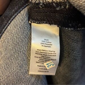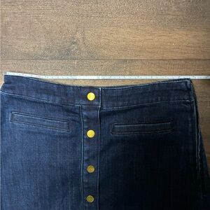 NWT Talbots dark wash A-line denim skirt. Hits below knee; see photos for measurements. Cotton poly blend, & the fabric has some stretch to it. Buttons are decorative, closure is an invisible side zip. Size 2, runs true to size.