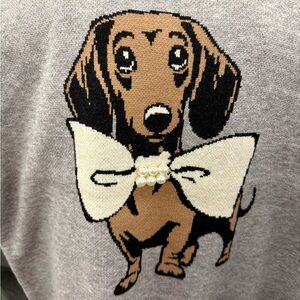 Charming gray sweater featuring a cute dachshund with a bow design. Ideal for dog enthusiasts.