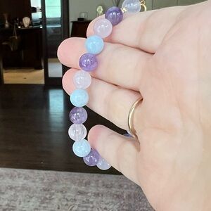 A colorful set in gentle pastels with amethyst and rose and white quartz beads and a lovely focal in rose quartz and amethyst. Length is 21 inches adjustable to 18.5 inches; the bracelet measures 9 inches adjustable to 7.25 inches; and the earrings measure 2 inches. Earring hooks are gold plated.