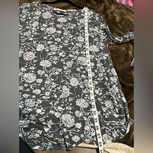 Introducing a stylish black tunic blouse adorned with an elegant white floral design. Crafted from a lightweight, sheer fabric, this piece is perfect for layering, allowing for a graceful drape that adds depth to your outfit. With long sleeves that provide versatility, you can easily dress it up or down, making it an essential addition to your wardrobe for any occasion.