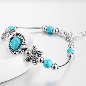 NWOT bracelet with turquoise stones and silver butterfly accents. Stainless 6” with 1 inch extender. Lobster claw closure.