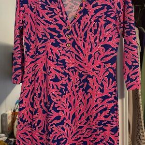 Vibrant floral pink top with navy long sleeves. Minimal wear.