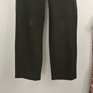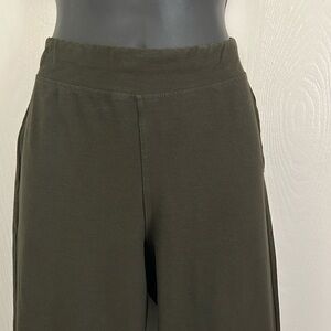 Eileen Fisher olive pull on pants in size Petite (XS). Elastic waist, crop length, stretchy crepe-feel, no pockets. Rise measures 9 1/2”, inseam is 25”, waist measures 13” across.