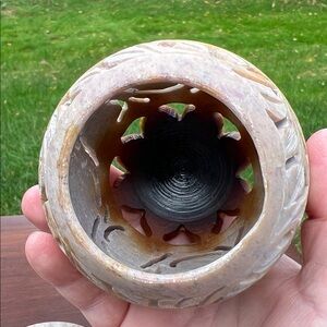 Beautiful carved stone sphere with intricate floral cutout patterns. Features a blend of earthy tones. Some wear from previous use as shown. 4” x 3” approximately.